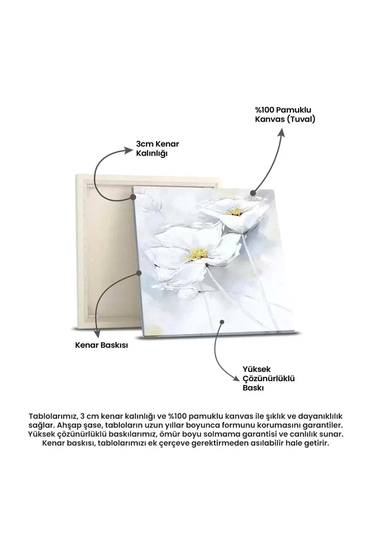 Özenle seçilmiş malzemelerle bir araya getirilmiştir. 3 cm kenar kalınlığı, tablolarımıza sağlam bir yapı ve şıklık katarken, %100 pamuklu kanvas kullanımı, orijinal tabloların dokusunu ve zarafetini en üst düzeye çıkarır. Bu özel kanvas, tablolarınıza modern ve şık bir hava katmanın yanı sıra uzun ömürlü bir sanat eseri sunar.